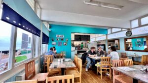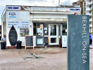 Op onze roadtrip door Zuid-Engeland belandden we per toeval in Bexhill-on-Sea. Op het eerste gezicht een niet al te bijzondere kustplaats in East-Sussex. Het was een grijze, grauwe miezerdag, maar na vele mijlen op de snelweg, wilden we de zee zien. Dus pakten we eerstvolgende afslag: Bexhill-on-Sea, parkeren de auto langs de boulevard en lopen over het kiezelstrand. Op de regenachtige boulevard staat een vierkante, witte blokkendoos. Fish & Chips staat erop. En Speciality Coffee. Het ziet er niet uit, maar de deur staat open en we hebben zin in iets warms.