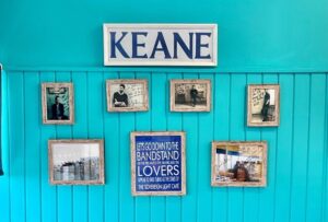 Binnen is het eenvoudig ingericht, een beetje kantine-achtig. Achterin een bar waar je eten en drinken kunt bestellen. Een lachend gezicht: “Welcome in the Sovereign Light Café, love”. Kijk, dan heb je me al. Ik weet dat het Engelsen standaard ‘love’, ‘dear’, ‘sweetheart’ achter elke zin plakken, maar ik hou ervan. We bestellen twee cappuccino. Mijn oog valt op een knalblauwe muur met een bordje waarop in koeienletters KEANE staat. Ervoor zitten twee dames. Als ze me zien kijken, vragen ze of ik ook fan van Keane ben. Nou, fan, is veel gezegd, maar ik heb hun muziek in m’n Spotify staan, ja.