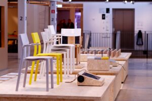 Op de tweede verdieping van het IKEA Museum komt een eindeloze stroom aan meer en minder bekende iconen uit zestig jaar IKEA – letterlijk – aan een lopende band voorbij. Net als de inbussleutel, de platte pakketten en de blauwe tas. Net als in de huidige winkelvestigingen zijn in het IKEA Museum huiskamers ingericht, maar wel met spullen én prijzen uit een bepaald jaar.