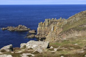 Het pad is niet echt uitgezet, er zijn meerdere ‘olifanten’paadjes die we volgen. Soms dicht bij de rand langs, soms wat hoger, soms mooi geplaveid, soms over en langs fraaie rotsformaties. Om de haverklap staan we stil om van de omgeving te genieten. Hier geen massa’s toeristen, die zijn na een kilometer al afgehaakt. Hoe verder je loopt, hoe rustiger het wordt. Met de verrekijker zien we dat er eilandjes voor de kust liggen. Ons oog wordt getrokken door beweging in het water. Zie je dat? Zijn dat? Yesss! Dolfijnen! Ze zijn met een groepje aan het (donder)jagen en wij zitten front row. Een mooie bonus bij deze toch al fraaie hike langs het westpuntje van Engeland.