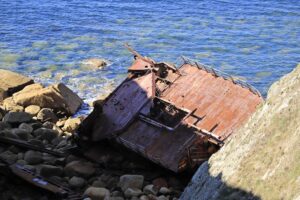 Land’s End is niet het einde van de wereld, maar verworden tot een toeristische attractie, inclusief toegangspoort, souvenirswinkels en Instagramspots. Die laten we dan ook snel achter ons. Het wandelpad dat hier langs de kust ligt, vinden we veel interessanter. Een hoge, ruige kust, die de afgelopen eeuwen de ondergang van menig schip is geworden. Zelf in onze tijd is het hier vaak niet pluis, getuige het verroeste karkas van een vrachtschip dat een paar jaar geleden op de rotsen eindigde.
