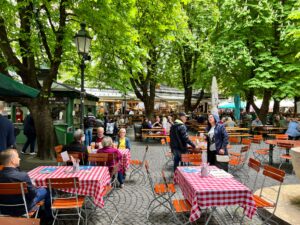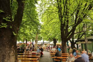 Ben je in Duitsland en zie je tientallen houten tafels met roodwitte kleedjes, stoelen en banken onder kastanjebomen staan, dan ben je bij een typisch Duits fenomeen beland. Een Biergarten. Dé plek waar locals graag samenkomen om te lunchen, met vrienden af te spreken of de dag af te sluiten. We kijken een paar uurtjes rond op de ‘levensmiddelenmarkt’ in hartje München waar de grootste Biergarten van de Beierse stad te vinden is.