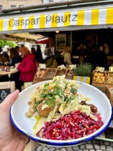 Bij sommige kramen kun je een warme lunchhap krijgen, zoals bij Caspar Plautz waar vegetarische aardappelgerechten op het menu staan. Tafeltjes zijn er niet, je eet je maaltje aan een statafel op. Erbij drink je een schorle gemaakt van biologische appels of ander fruit uit Beieren. Even verderop kun je nog een vitamineboost halen bij een sapkraam. Liever koffie? Kein Problem. Bij de Rösterei Viktualienmarkt scoor je de beste koffie van München (vandaar die lange rij!). Neem er vooral ook een Florentine bij. Hoewel niet van Duitse oorsprong, is dit langwerpige, enigszins taaie koekje met amandel en chocola dé lekkernij van München. En ben je toe aan bier? De Biergarten kan je niet missen: onder de grote kastanjebomen.