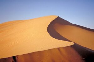 Vlak voor zonsondergang zijn we na een paar uur hobbelen met een fourwheeldrive over de desert highway bij het tentenkamp in de Sharqiyah-woestijn aangekomen. Want die zonsondergang is er eentje die je niet mag missen. De zon zelf is niet zo spectaculair. Wel het licht dat dit hemellichaam verspreidt over de eindeloze woestijnduinen. Een schilderpalet met rood, bruin en geel tovert vijftig tinten oranje om mij heen. De schoonheid van dit fenomeen is nauwelijks in beeld of woord over te brengen, dus blijf ik er stil naar kijken.