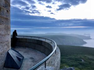 De tweede vuurtoren van Ouessant, Stiff – Bretons voor bron – staat negentig meter boven zeeniveau en is een ‘monument historisque’. In 1699 gebouwd als en echte vuur-toren, oftewel een toren waar bovenin een vuur brandde. Sinds 1780 een vuurtoren met rode verlichting, ten teken dat men in een gevaarlijk gebied is beland. Twee keer per week wordt de vuurtoren opengesteld voor publiek. Ondine heeft de sleutel en opent de deur. Na ruim honderd treden staan we boven. Mistflarden komen en gaan. Het ene moment heb je ruim zicht over het eiland, een paar minuten later kan het weer helemaal dichtgetrokken zijn. Bij vrij zicht zie je diverse vuurtorens staan, op de omringende eilanden en midden op zee. Je ziet ook dat het landschap hier totaal anders is dan bij de andere kant van het eiland. We zijn hier op het hoogste punt van Ouessant. Geen rotsen maar een enigszins glooiend, groen landschap. Bijna saai, eigenlijk.