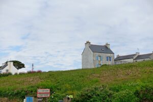 Wij komen heelhuids aan de overkant. Eenmaal op het eiland, huur je een fiets in het enige dorp van betekenis – tevens hoofd’stad’- Lampaul. Het is de meest ideale manier om Ouessant te verkennen. Wandelen kan ook prima. In Lampaul vind je de winkeltjes, hotels en restaurants van het eiland. Dat wil zeggen: op het hoge deel van het dorp. Drie keer per jaar stroomt het lage deel over, bij springtij. Ooit vormde dit eiland de meest westelijke punt van het departement Finistère – ‘einde van het land’- maar sinds de laatste ijstijd en de daaropvolgende zeespiegelstijging kun je hier niet meer over land komen. Samen met andere eilandjes vormt Ouessant de Archipel van Molène, midden in de Keltische Zee, zoals dit deel van de oceaan heet. De ligging van deze eilanden, in combinatie met het samenkomen van Het Kanaal en de Atlantische Oceaan, zorgt voor zeer gevaarlijke stromingen in dit gebied. Duizenden stille getuigen liggen op de bodem van de zee. Daar trekken de dolfijnen die in dit gebied wonen, zich niks van aan. Met een beetje mazzel zwemmen ze met je boot mee.