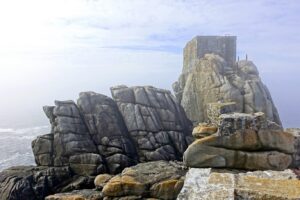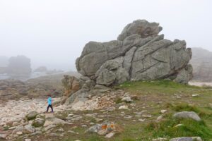 De ruïnes van Pointe de Perne staan in een surrealistisch, bijna onaards landschap. Het zijn de enige sporen van menselijk handelen. Verder is dit gebied ‘sinds de prehistorie onveranderd’, vertelt gids Odine. Enorme rotsblokken in bizarre vormen, ‘stranden’ waar enorme witte keien liggen, velden vol heide, varens en mos die zo zacht als een matras zijn, vormen het decor. De mist zorgt voor een mystieke sfeer, terwijl op de achtergrond de zee onvermoeibaar tegen de rotsen klapt. Odine kent de weg en een smal paadje leidt naar een van de losse rotsformaties die schijnbaar willekeurig zijn neergelegd. “De rotsen hebben allemaal een Bretonse naam en zijn vernoemd naar de druïden die ooit op Ouessant woonden”, vertelt Ondine. Ook zijn er op de rotsen tekens te zien die al eeuwenoud zijn.