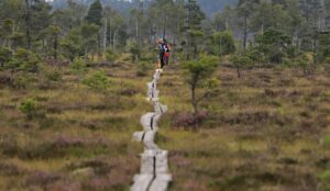 Met gids Erika lopen we op knalrode ‘tennisrackets’ door een stil landschap dat golft onder onze voeten. Nationaal Park Store Mosse (iets ten noordwesten van de stad Värnamo) is een duizenden jaren oud hoogveengebied. “Dit is een stukje Lapland in het zuiden van Zweden”, vertelt ze. De natuur hier is te vergelijken is met die in het hoge noorden. “Met meer dan 25 soorten mos, vleesetende plantjes, bossen en kleine boompjes, net als in Lapland”, somt Erika op. We lopen op de bodem van een oud meer, dat grotendeels is opgedroogd maar nog steeds ‘nat’ is. Onder onze voeten bevindt zich een vijf meter dik pakket van afgestorven veenmos. Erika bukt, stroopt haar mouw op, steekt haar arm moeiteloos in het zompige land en tovert een handvol smurrie tevoorschijn. “Kijk”, zegt ze. “Dit is minstens driehonderd jaar oude turf.”
